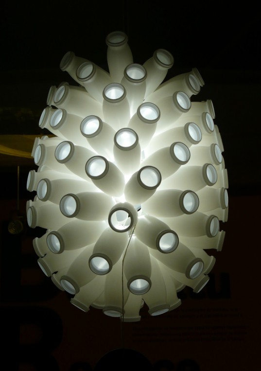 This pendant light is made from a school dining hall's yogurt bottles! WOW! Retro Modern.